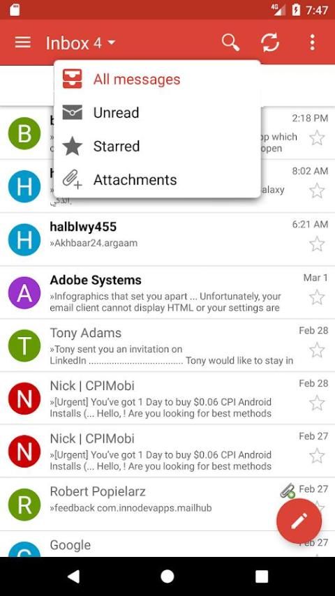 - एकीकृत इनबॉक्स एक ही स्क्रीन में सभी ईमेल को पढ़ने के लिए