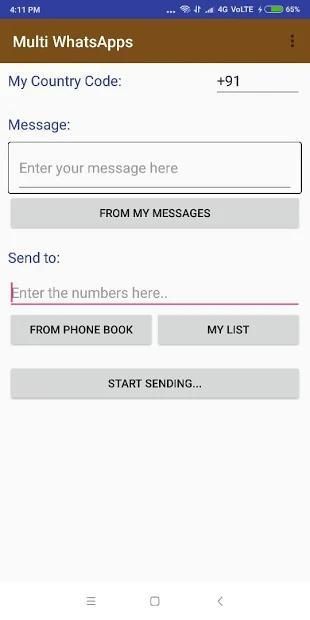 दोहराव वाले प्रेस 'प्रेषण-बैक-बैक' बटन द्वारा ज्ञात / अज्ञात संख्याओं के लिए एकाधिक व्हाट्सएप संदेश भेजें।