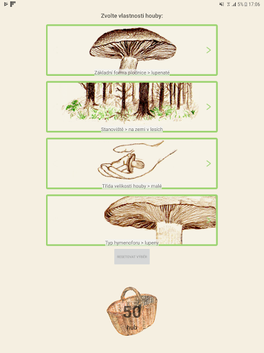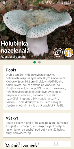 मशरूम एप्लिकेशन में विस्तृत विवरण और गुणवत्ता वाली तस्वीरों के साथ 200 से अधिक सबसे आम मशरूम का एक विस्तृत एटलस होता है।इसके अलावा, दृश्य पात्रों के अनुसार मशरूम प्रजाति का निर्धारण करने के लिए एक कुंजी है।हालांकि, आवेदन की सबसे बड़ी विशेषता एक तंत्रिका नेटवर्क का उपयोग करके ऑप्टिकल कवक मान्यता के लिए प्रयोगात्मक कार्य है।