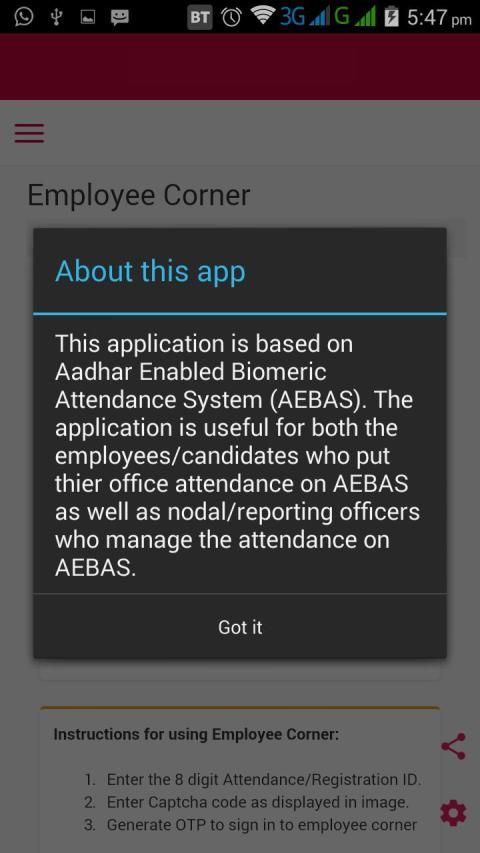असल में इस एप्लिकेशन को आधार सक्षम बॉयोमीट्रिक उपस्थिति प्रणाली (AEBAS) पर आधारित है और उस के लिए लिंक शामिल है।
