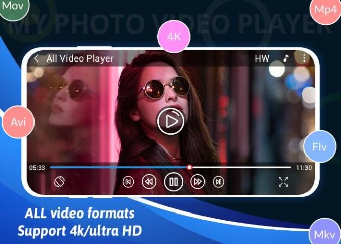 My Photo Video Player - Full HD Video Player is a professional video playback tool. It supports ALL video formats, 4K/ultra HD video files, and plays them with high-definition. It is one of the best HD video player for android tablet and android phone. Video Player All Format also protects your private video from being deleted or seen when people use your device.