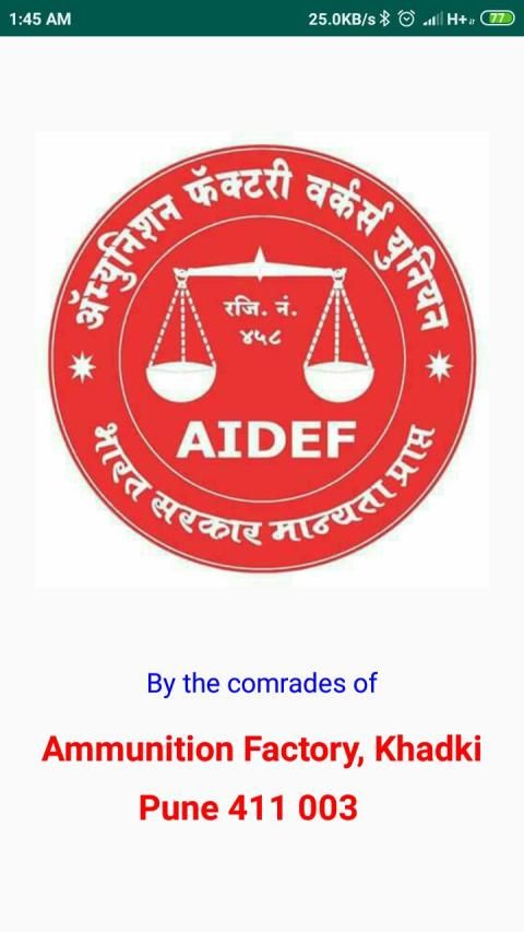 The 'Ammunition Factory Workers Union (R)' is a Union of workmen of Ammunition Factory, Khadki, Pune. The Union is affiliated to 'All India Defence Employees Federation' and 'Hind Mazdoor Sabha', which has its central office at Khadki, Pune. The union is working for welfare of the employees as well as awareness towards the work culture. The ‘All India Defence Employees federation’ is the pioneer movement of workers of country which is working for all defence workers in the country and the 'Ammunition Factory Workers Union (R)' is first affiliated union to the federation.