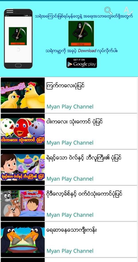 Myan Play Channel က ကေလးေတြအတြက္ပါ ျမန္မာအသံထြက္ပံုျပင္ေတြနဲ႔ ကေလးေတြအတြက္ သီခ်င္းေလးေတြပါပါေတာ့ ပိုၿပီးအဆင္ေျပမယ္လို႔ယူဆပါတယ္..