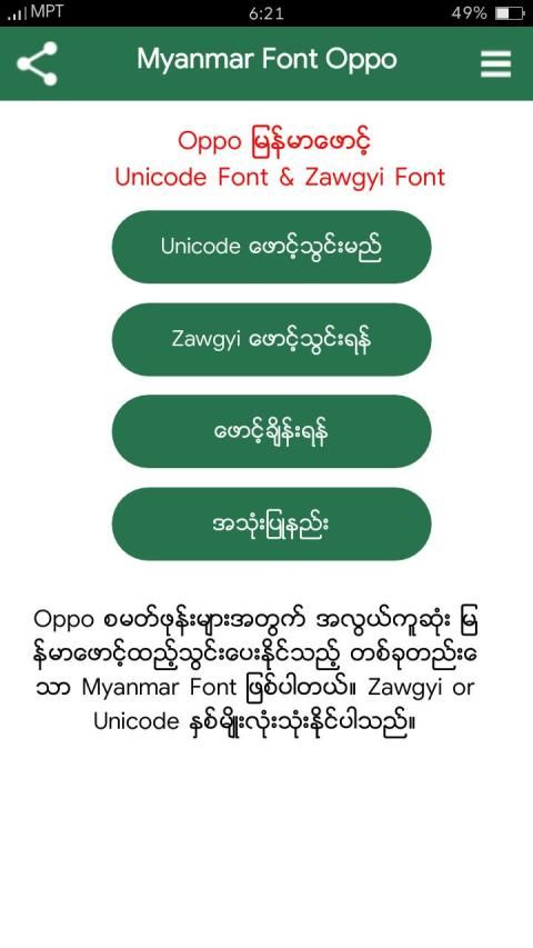 Here provides top Free Android Apps. 20,000+ users downloaded Myanmar Font Oppo latest version on 9Apps for free every week! The app has also been given a bit of a visual makeover, too This hot app was released on 2020-06-04. If you still need more information collecting extra factors, read below.