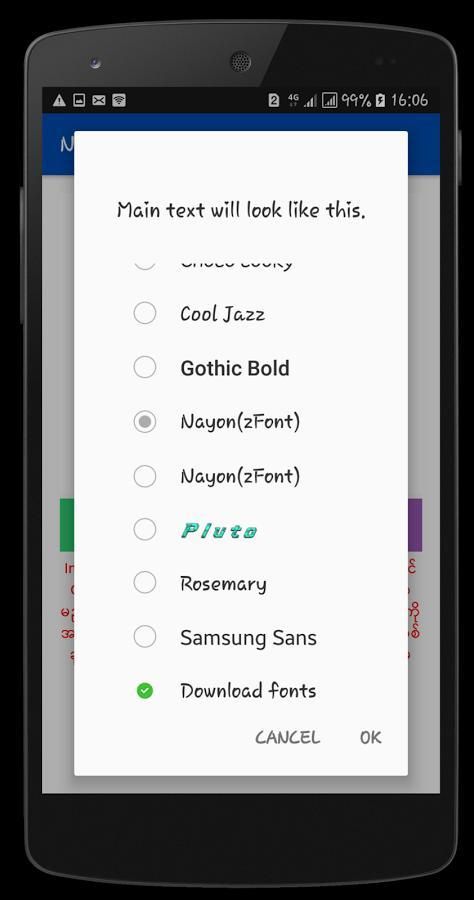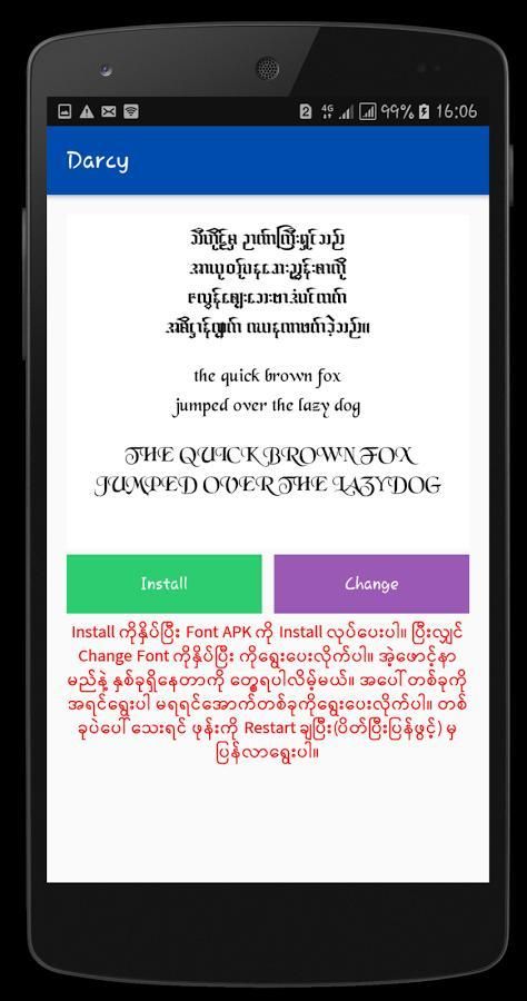 အ ရင္ က iFont ေတြ HiFont ေတြ ကို ဖုန္း ဗား ရွင္ 5.0 အ ထက္ ေတြ မွာေ ဖာ င့ ္ခ ် ိန္း လို 4 မရပါ।