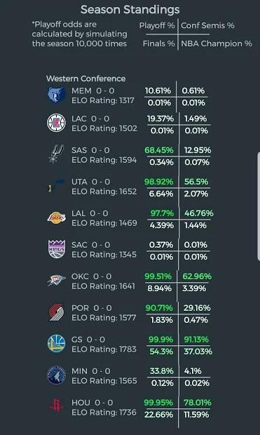 Play प्लेऑफ बनाने, सम्मेलन सेमीफाइनल बनाने, अपने सम्मेलन जीतने और एनबीए फाइनल चैंपियनशिप जीतने के लिए प्रत्येक मौजूदा टीम और बाधाओं को जीतने के लिए प्रत्येक टीम की बाधाओं की गणना करें। प्लेऑफ बाधाओं की गणना 10,000 सीजन सिमुलेशन के परिणामों के आधार पर की जाती है