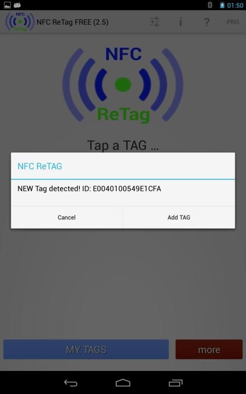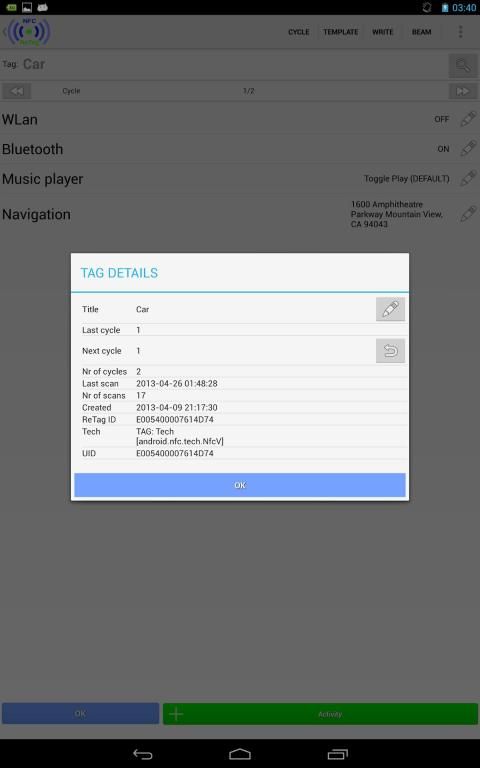 You can use this app to associate multiple functions (e.g. Wlan OFF, Bluetooth ON, Mobile Data TOGGLE, start navigation,run Tasker task, start any installed app, use media buttons, call a phone number, add a timestamp, calendar entry, add Text-to-Speech and much more!) to a NFC (near field communication) tag via an app internal database. You can even add tag cycles and let your tag run different activities per scan. So ReTag is the perfect NFC automation tool for you ;-).