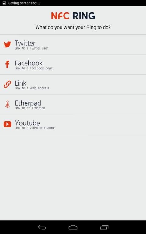 एनएफसी रिंग एप्लिकेशन फेसबुक, ट्विटर, सामान्य वेबसाइट लिंक, Etherpad और यूट्यूब के लिए समर्थन में बनाया गया है.