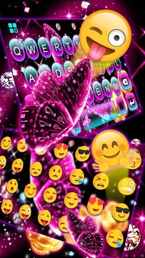 नियॉन पिंक बटरफ्लाई कीबोर्ड थीम में सामग्री हेतु नवीनतम डिज़ाइन, आकर्षक फॉन्ट और कई प्रकार के रोचक ईमोजी व मीम मौजूद हैं।