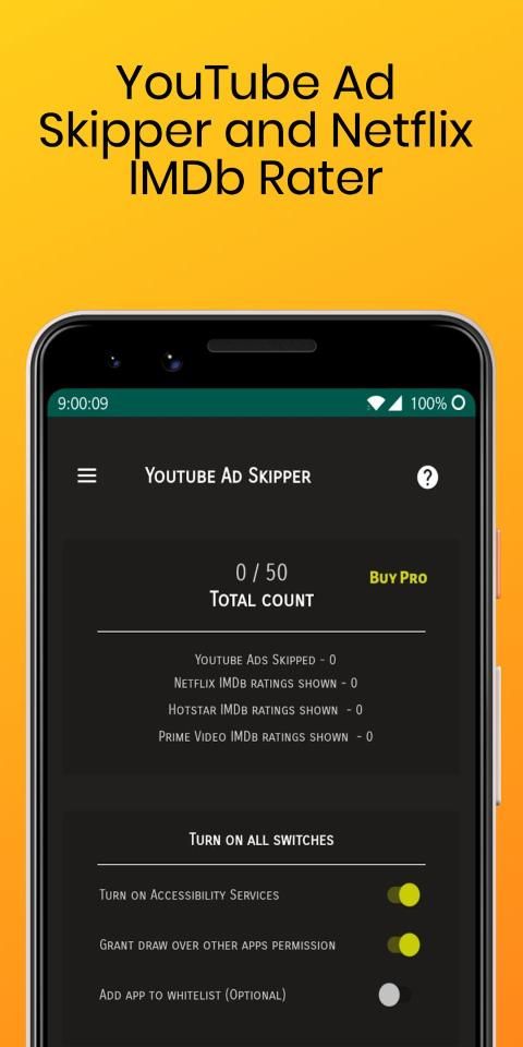 एप्लिकेशन विज्ञापनों को छोड़ने के लिए एक्सेसिबिलिटी सर्विसेज पर निर्भर करता है, आपको उस शीर्षक की त्वरित IMDB रेटिंग प्रदान करता है जिसे आप देखने जा रहे हैं।