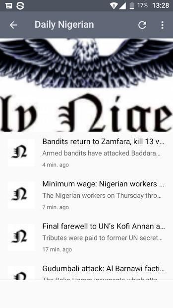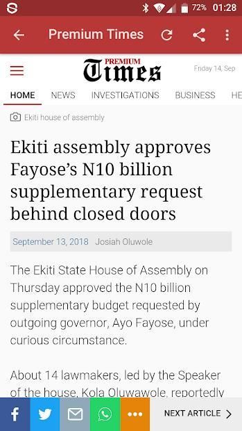 यह एप्लिकेशन अब तक स्टोर में सबसे अच्छा नाइजीरियाई अख़बार ऐप है। यह आपको ब्रेक के रूप में समाचार लाता है, आपको बस अपने पसंदीदा समाचार पत्र को ताज़ा करने की आवश्यकता होती है। ऐप आपको नाइजीरिया में विभिन्न मीडिया हाउस से राजनीति, मनोरंजन, व्यापार, अर्थव्यवस्था, खेल, कला, प्रौद्योगिकी, स्वास्थ्य और प्रौद्योगिकी में नवीनतम समाचार लाता है जिसमें शामिल हैं: