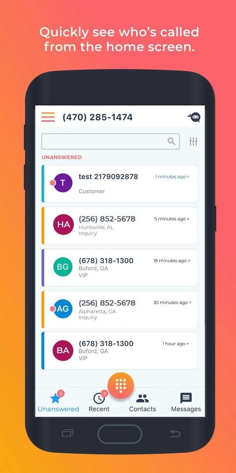 निन्जा टीम - इसे अकेले न जाने दें। 5 फोन तक लिंक करें। इस तरह आपकी पूरी व्यावसायिक टीम कॉल का जवाब देने, वॉइसमेल और टेक्स्ट का जवाब देने के लिए तैयार है, और ग्राहकों के साथ बातचीत पर सहयोग करती है, सभी एक ही धागे के भीतर। सभी प्रतिक्रियाओं को ट्रैक किया जाता है, इसलिए आप हमेशा लूप में रहते हैं।