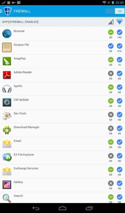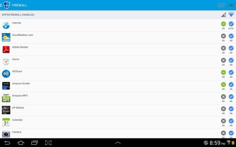 * मोबाइल नेटवर्क और वाईफाई नेटवर्क के साथ इंटरनेट का उपयोग करने के लिए प्रत्येक अनुप्रयोग के लिए उपयोग की अनुमति नियंत्रित करते हैं।