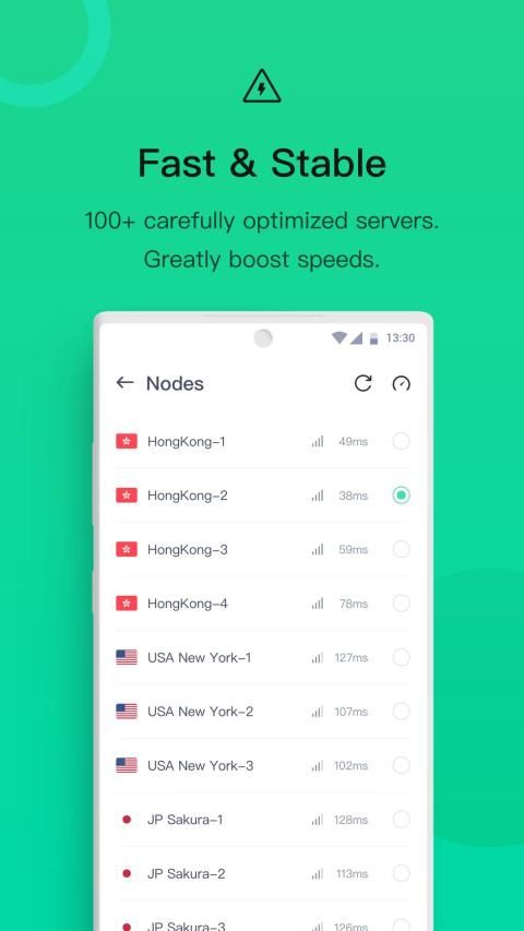 8 देशों और क्षेत्रों में 38 सर्वर क्लस्टर से कनेक्ट करें और आप इंटरनेट के किसी भी हिस्से तक पहुंच सकते हैं। दुनिया भर में बेहतर नोड्स के साथ, आपकी सभी ज़रूरतें तुरंत पूरी हो सकती हैं।
