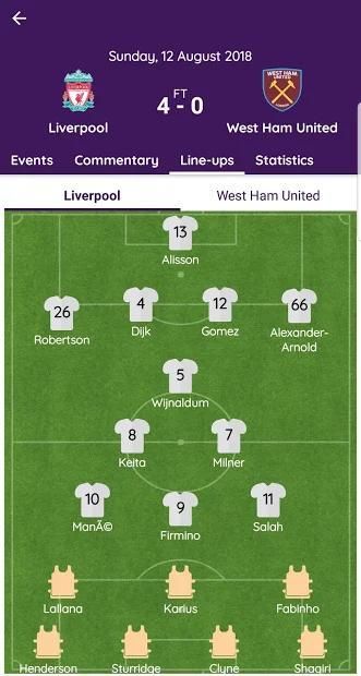 Included live fixture, updates, events, commentaries, lineups, match stats for