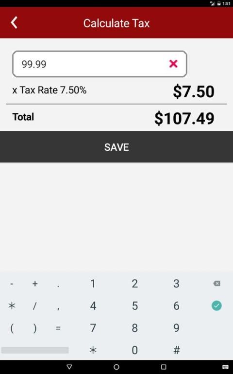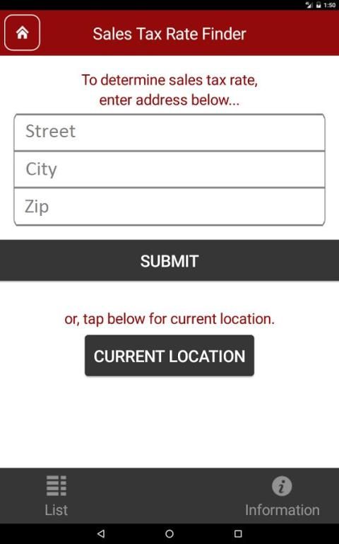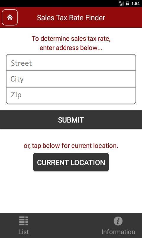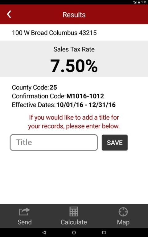 • बिक्री कर की राशि एकत्र करने या भुगतान करने के लिए गणना करने के लिए एक पता, ज़िप कोड या अपने वर्तमान स्थान (जीपीएस का उपयोग) दर्ज करने की क्षमता।