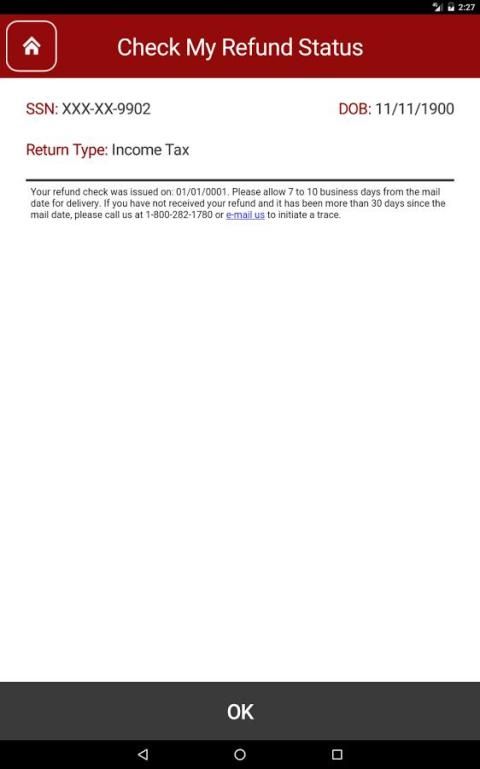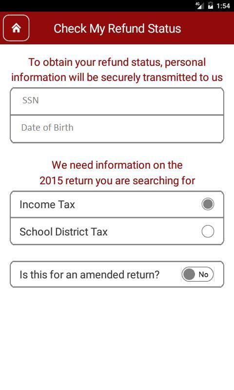 यह अनुप्रयोग केवल आप बदले पिछले कर वर्ष के लिए चालू वर्ष में दायर की स्थिति की जांच करने के लिए अनुमति देता है। आप कुछ व्यक्तिगत जानकारी दर्ज और कर के प्रकार और वापसी प्रकार आप के बारे में पूछताछ कर रहे हैं की पहचान करनी चाहिए। विशेषताओं में शामिल: