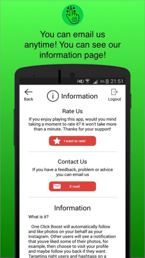 एक क्लिक प्रबंधक अन्य उपयोगकर्ताओं के साथ संलग्न करेंगे। अन्य उपयोगकर्ताओं को एक सूचना है कि आप अपने फ़ोटो में से कुछ को पसंद किया है, उदाहरण के लिए देखेंगे, और फिर अपने प्रोफ़ाइल का दौरा करने और हो सकता है आप का पालन वापस अगर वे चाहते हैं। सही उपयोगकर्ताओं और हैशटैग का लक्ष्य निर्धारण बहुत महत्वपूर्ण और उच्च गुणवत्ता तस्वीरों के साथ एक महान खाता होने का सबसे अच्छा तरीका इस रूपांतरण संख्या में वृद्धि करने है।