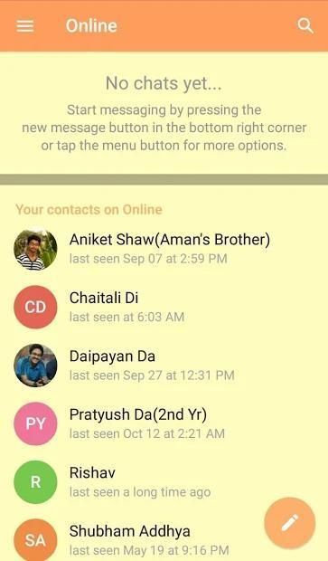 ऑनलाइन एंड्रॉइड उपकरणों के लिए एक मुफ़्त मैसेजिंग ऐप है। उपयोगकर्ताओं को टेक्स्ट और दोस्तों और परिवार के सदस्यों को कॉल करने के लिए फोन के इंटरनेट कनेक्शन की आवश्यकता होती है। उपयोगकर्ता टेक्स्ट संदेश, फोटो, वीडियो, दस्तावेज़ और वॉयस संदेश भेज और प्राप्त कर सकते हैं।