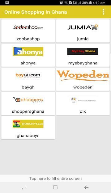 वहाँ घाना के खरीदने के लिए लोगों को, जो कुछ भी वे चाहते हैं के लिए नि: शुल्क ऑनलाइन शॉपिंग एप्लिकेशन है। शुभकामनाएँ और अग्रणी घाना की ऑनलाइन शॉपिंग वेबसाइटों अपना समय बचाने के लिए और आप के लिए आसान खरीदारी बनाने के लिए इस ऐप्लिकेशन में कर रहे हैं। आप इस तरह के रूप में उत्पादों की विस्तृत श्रृंखला खरीदारी कर सकते हैं फैशन, परिधान, इलेक्ट्रॉनिक्स, सामान, कपड़े, जूते, मोबाइल फोन, घड़ियां, धूप का चश्मा, सुगंध, सौंदर्य प्रसाधन, बिक्री उत्पादों, अंडरवियर, ब्रा आदि और जो कुछ आपको लगता है यात्रा।