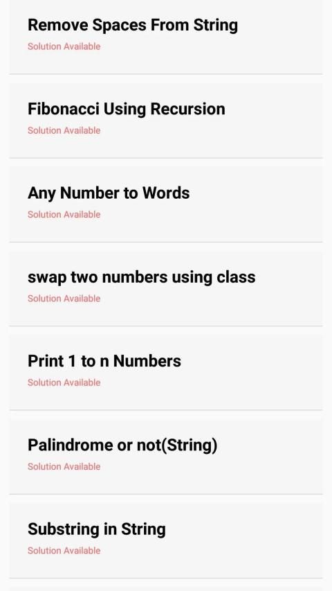 Whether you are an experienced programmer or not, this app is intended for everyone who wishes to learn the programming language. This app will help students and freshers who are looking for a job or who have an exam or who have an interview. In this app, you will get the more than 150+ offline problems and also get online problems which are updated on every week.