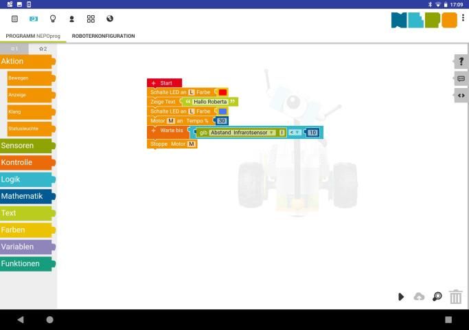 कोड और प्ले - ओपन रॉबर्टा® लैब में आप ग्राफिक प्रोग्रामिंग भाषा NEPO® के साथ अपने रोबोट और माइक्रोकंट्रोलर को जीवन में लाते हैं। ड्रैग और ड्रॉप के साथ आप विभिन्न प्रणालियों के लिए प्रोग्राम जल्दी और playfully बनाते हैं। »ओपन रॉबर्टा मोबाइल« ऐप का उपयोग करके, आप वायरलेस रूप से ब्लूटूथ के माध्यम से लेगो शिक्षा वीडीओ 2.0 के लिए एनईपीओ प्रोग्राम भेज सकते हैं - चाहे स्मार्टफोन या टैबलेट पर हों।