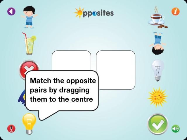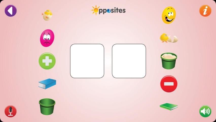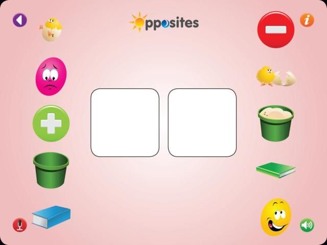 2 विपरीत - 3 + आयु वर्ग के बच्चों के लिए बनाया गया है. यह निम्न विपरीत शब्द हैं: ऊपर / नीचे, गुस्सा / शांत, प्रारंभ / समाप्त करें, काला / सफेद, बहादुर / कायर, खुला / बंद, दीप / उथले, प्रथम / अंतिम, सामने / वापस, में जाओ / बाहर जाओ, जा रहे हैं ऊपर / नीचे जा रहे हैं, हार्ड / शीतल, स्वस्थ / बीमार, लैंडिंग / उतारो, जोर / चुप, पुरुष / महिला, साफ / गंदा, पुराने / नई, पुश / खींचो, उसी अलग / तीव्र / ब्लंट, सिंक / फ्लोट, / बैठो, मजबूत / कमजोर, मीठे / खट्टे, पतला / वसा, फेंको / पकड़, गीले / सूखी, विन / हानि, युवा / पुराने स्टैंड.