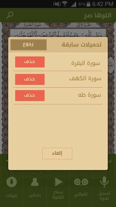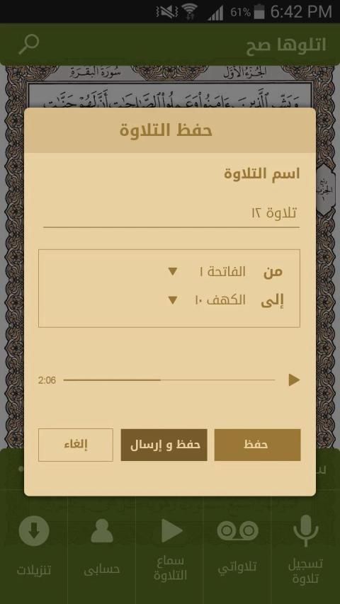 5. إمكانية إعادة إرسال التلاوة وحفظها : (يمكن للمستفيد أن يجمع تلاوته فينشئ مصحف بصوته لكامل القرآن وينشره ) .