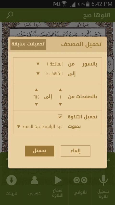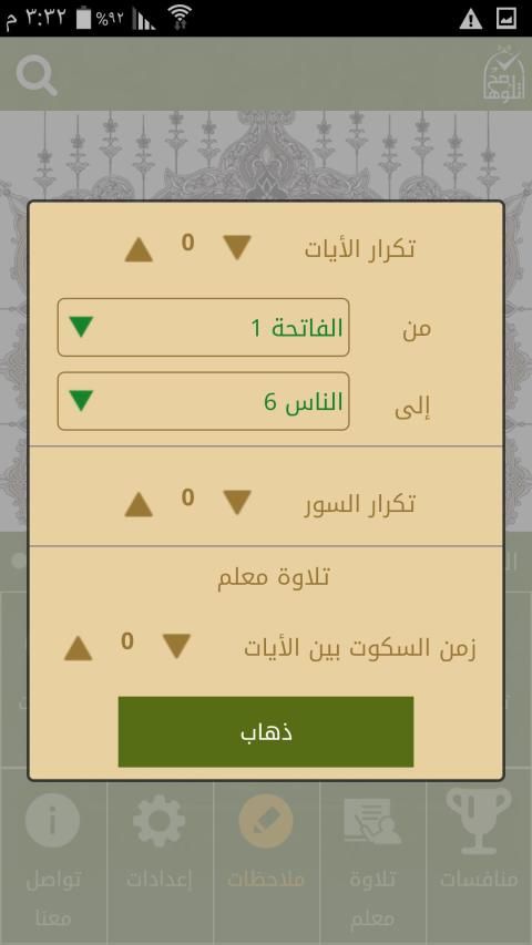 4. إضافة تلاوة معلم وتحديد نطاق للآيات لمساعدة المستفيد في التلقين و الترديد مع القارئ .