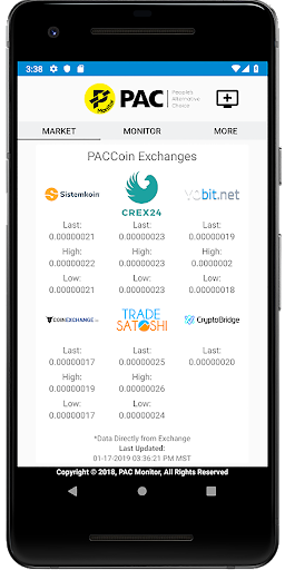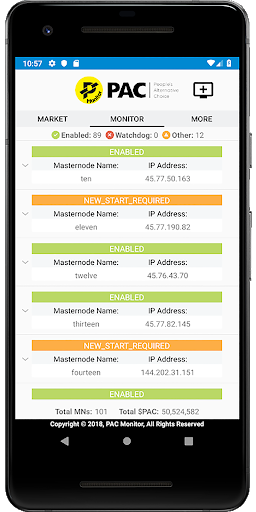 Current Features: Multi-Masternode Management, Status Change Notifications, Payment Notifications, Direct Exchange API queries for 24hour "Last", "High", & "Low" trades, CoinMarketCap.com Stats, Masternodes.online Income data, and quick access links to $PAC Social Media outlets.