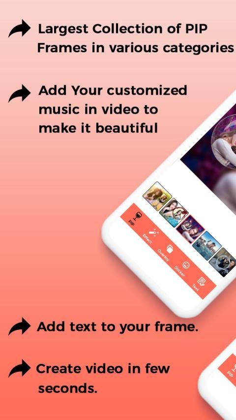 . an app which has two option which PIP image maker and also PIP video maker. decorate your wish video clip after decorating images, the app has an amazing collection of PIP frames or many more to decorate your image instant and you can change it into little video clip.