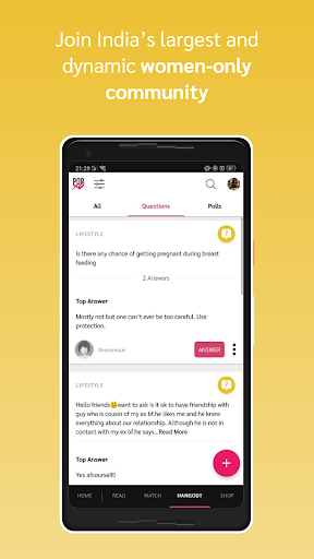 ऑनलाइन समुदाय: भारत की सबसे बड़ी महिला-केवल समुदाय से जुड़ें। एक प्रश्न पूछें या एक मतदान करें। अपने प्रश्नों का उत्तर देकर दूसरों की मदद करें। अपनी प्रतिभा, जीवन हैक्स साझा करें या सिर्फ आपके जैसी महिलाओं को सरल सलाह दें। Hangout ऐप-एक्सक्लूसिव के साथ, यह अधिक मजेदार और सुरक्षित होगा।