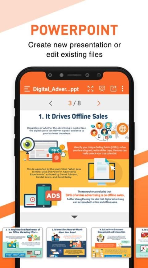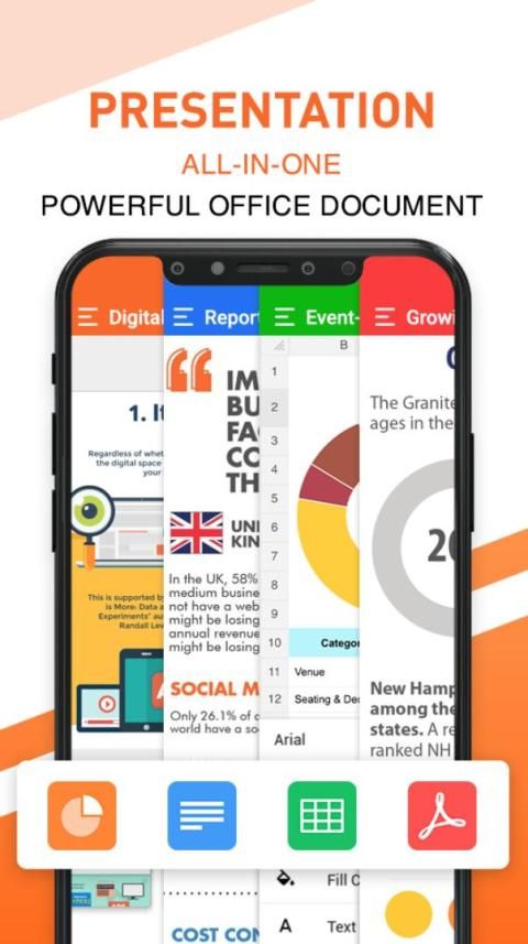 Work from anywhere with any type of document: XLS spreadsheets, DOC documents, PPT slides, ODT standard files. PPT Office: Word, Docx reader, keynote, PDF allows you to view and read over any kind of documents.