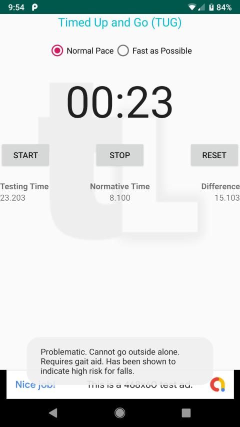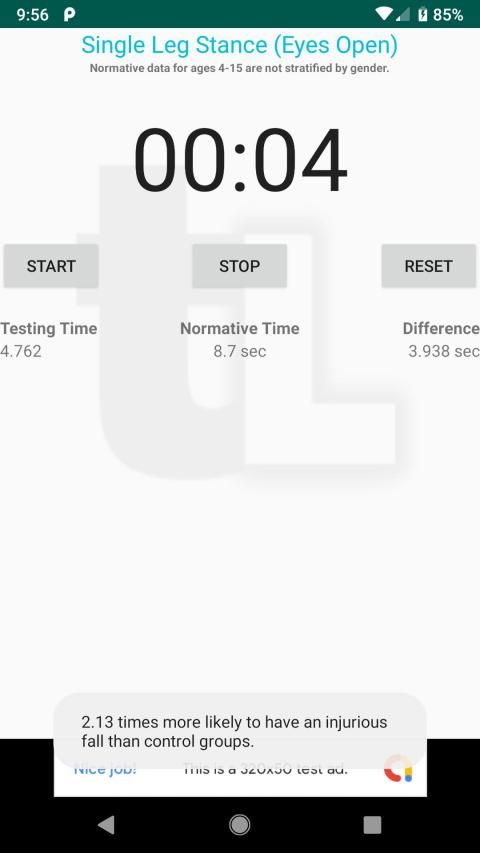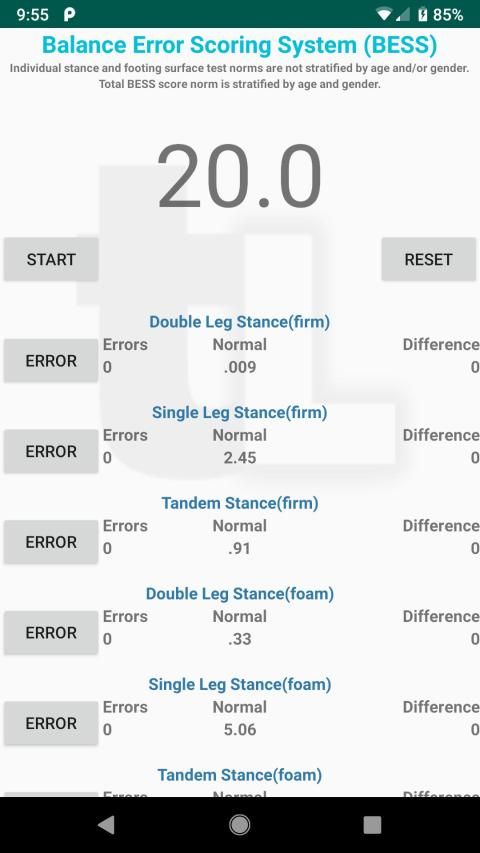 यह उपकरण निर्णय लेने, लक्ष्य निर्धारित करने और परीक्षण के साथ मनमानी कटौती से बचने में सहायता करने के लिए है। मानक डेटा के अलावा, इस एप्लिकेशन में परिणामों की उपलब्ध व्याख्याएं शामिल हैं। यह ऐप भौतिक चिकित्सक (पीटी), भौतिक चिकित्सक सहायक (पीटीए), एथलेटिक प्रशिक्षक (एटीसी), व्यावसायिक चिकित्सक (ओटी), नर्स और अन्य संबद्ध स्वास्थ्य पेशेवरों के लिए आदर्श है। यह केवल रोगी देखभाल का मार्गदर्शन करने के लिए उपयोग नहीं किया जाना चाहिए, न ही यह नैदानिक निर्णय के लिए एक विकल्प होना चाहिए। उपभोक्ता (गैर-चिकित्सा पेशेवर) जो उपकरण या डेटाबेस का उपयोग करते हैं वे अपने जोखिम पर ऐसा करते हैं।