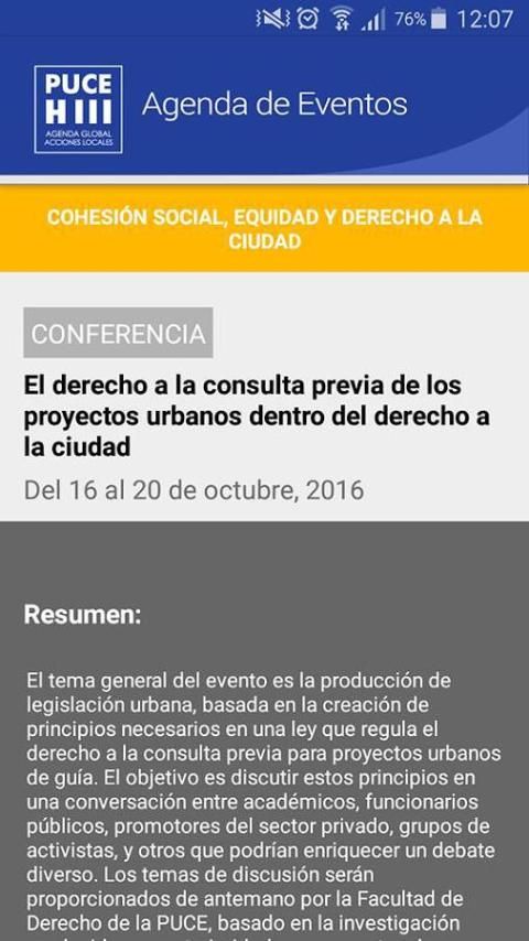 बिशप कैथोलिक वास्तुकला के संकाय में स्नातकोत्तर अध्ययन के माध्यम से इक्वाडोर के विश्वविद्यालय, डिजाइन और कला के लिए एक शैक्षिक घटना, संयुक्त राष्ट्र के प्रस्ताव से जुड़े हैबिटेट III के लिए उठाए गए विषय क्षेत्रों के माध्यम से फेंकता प्रस्तुत करता है।