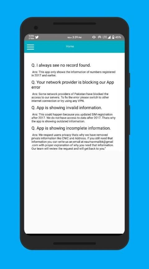 The data used in this app is pretty much limited and outdated. Developers of this app respect privacy of people. This app does not show data of the users who have verified their SIM using bio metric verification. The developers of the app are always willing and ready to take down this app if the government or concerned authorities of Pakistan want to remove this app.The data shown in this Number Tracker App is provided free of charge for informational purposes only, with no guarantee of whatsoever for accuracy, validity, availability, or fitness for any purpose. Use at your own risk.