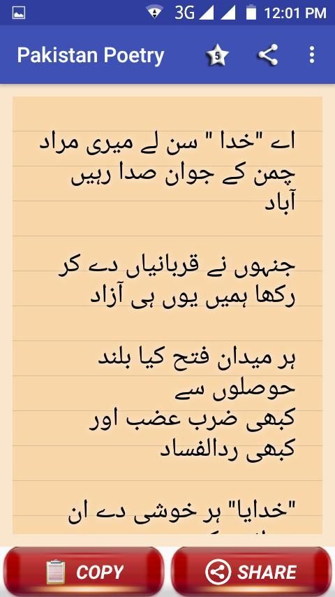 This app contain superb collection of pakistan poetry , pakistan independance day wishes and status collection . 14 august sms and wishes. pakistan foaj poetry, patriotic poetry. pakistan zindabad shayari. Allama iqbal and mehdi hassan shairi.