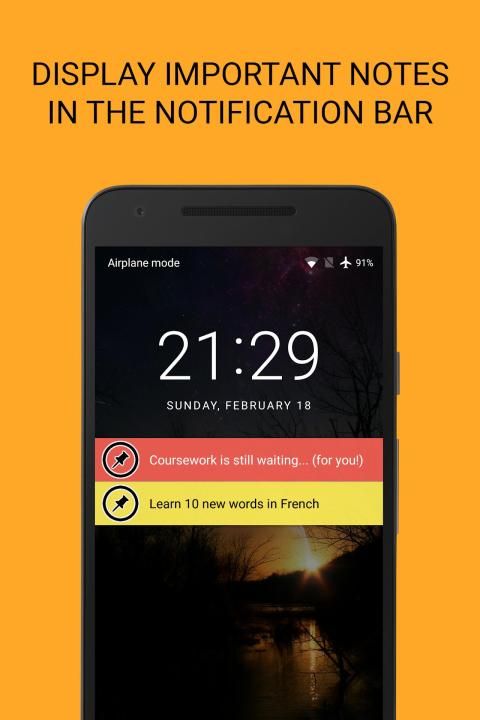 You study or work on a project, plan an official event or meeting with friends - Panorama will not let you to forget about it. In just a couple of clicks you will be able to bring important notes, reminders directly to the status bar and to the lock screen. Everything you need to remember will always be before your eyes.