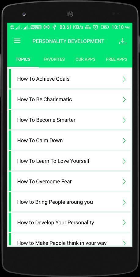 I wants to share an app for all of you. 30,000+ users downloaded Personality Development latest version on 9Apps for free every week! More apps are free download here! This hot app was released on 2016-12-27. If you want it so go head and download it and enjoy your app.