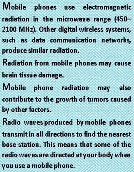 मोबाइल फोन माइक्रोवेव रेंज (450-2100 मेगाहर्ट्ज) में विद्युत चुम्बकीय विकिरण का उपयोग करें। इस तरह के डेटा संचार नेटवर्क के रूप में अन्य डिजिटल वायरलेस सिस्टम, समान विकिरण का उत्पादन।