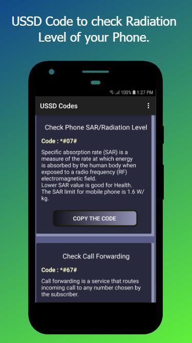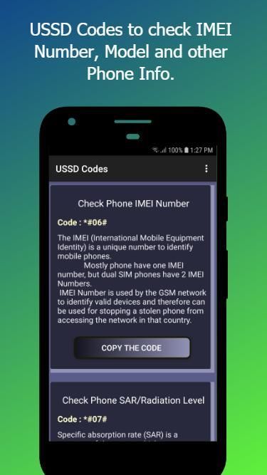 The app Contain USSD Codes that you can use to find/check hidden info of your Phone like IMEI Number, Phone Radiation Level, Model, Software Version, Android Version, Call Settings, Network Info and many More.