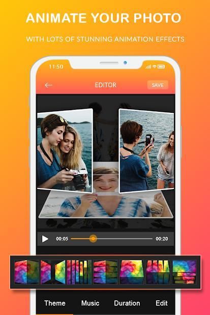 साथ ही आप अपने स्वयं के वीडियो बनाने के लिए पूर्ण पृष्ठभूमि, संगीत और एनीमेशन के साथ विभिन्न ऑर्डर में फ़ोटो व्यवस्थित करते हैं।