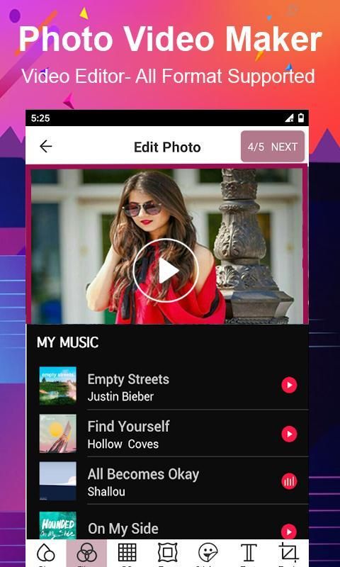 Photo Video Editor is the easiest way to create, edit and save amazing music videos, slideshows and stories with your photos, videos and free music of your own choice.