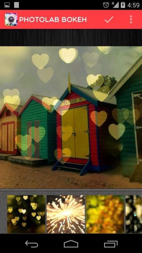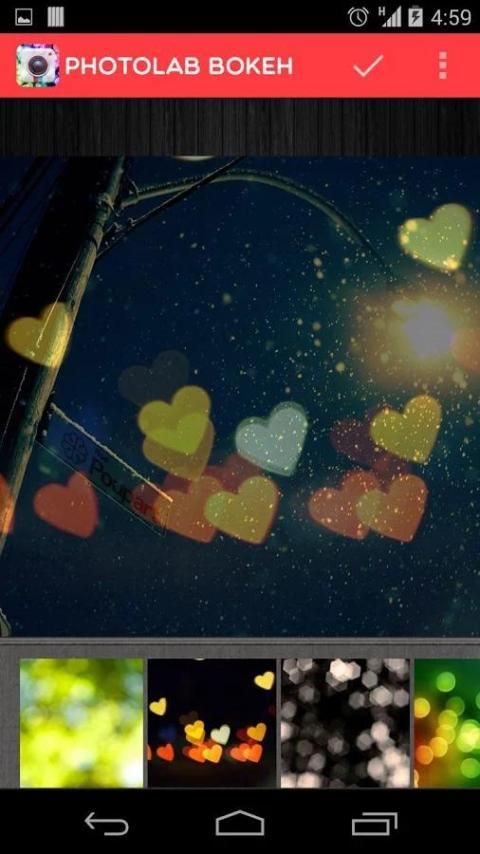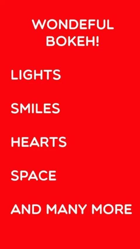 · Bokeh के विभिन्न रूप (वृत्त, फूल, दिल, सितारा), प्रकाश लीक या स्ट्रीम, और अपने दोस्तों के साथ अपनी तस्वीर साझा के बीच चुनें