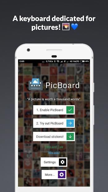 PicBoard is a Keyboard application which can be used to search the entire web for photos which can be sent directly to the intended recipient right from the chat screen. It is free and has no annoying ads or forced ads.