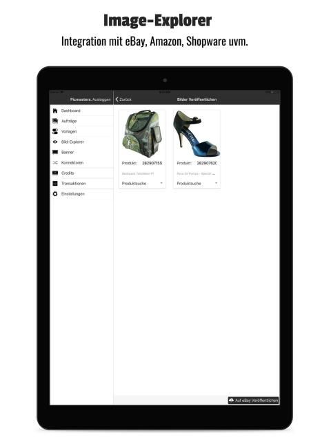Über den Image-Explorer kannst du Bilder direkt vom Marktplatz abrufen, zur Bearbeitung schicken, und danach wieder auf dem Marktplatz veröffentlichen. Und das mit nur wenigen Klicks. (eBay, Amazon, Shopware und Plentymarkets)