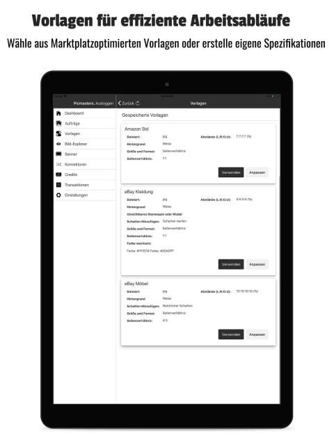Nach dem Upload deiner Bilder bei Picmasters kannst du eine neue Vorlage mit deinen Spezifikationen erstellen oder eine Beispielvorlage wählen.