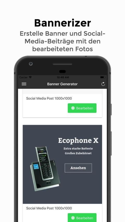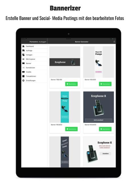 Deine Fotos werden von professionellen Grafikern ganz nach deinen Bedürfnissen aufgearbeitet und für online Marktplätze und Webshops optimiert. Mit unserem Banner Generator kannst du zusätzlich nach der Bearbeitung kostenlos hochwertige Werbemittel und Social-Media Posts erstellen.