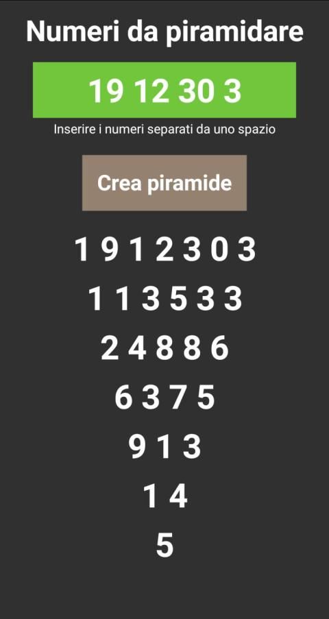 Piramidare è una tecnica cabalistica usata nel gioco del Lotto in cui i numeri, sommati tra loro a due a due (utilizzando la regola del fuori 9), ricreano una piramide fino ad arrivare ad un numero ad una sola cifra. Con questa applicazione potete piramidare una sequenza di massimo dieci numeri nell'intervallo [1-90].