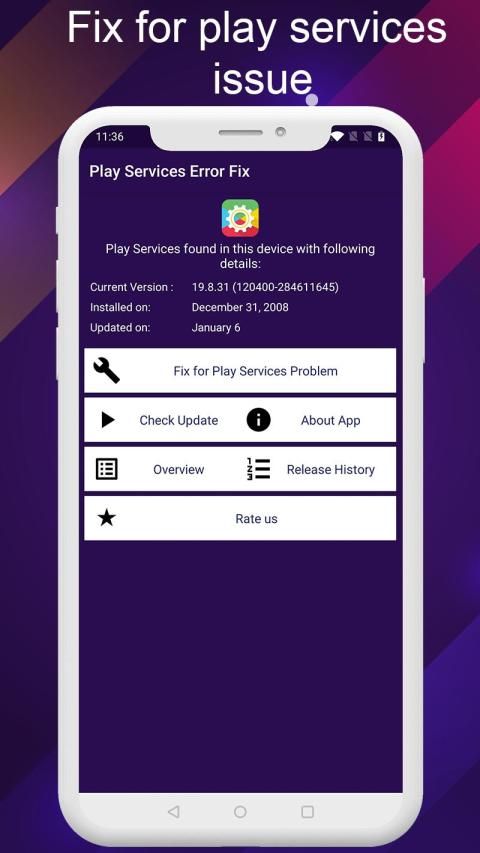 Play-Service Fix 2020 एक उपयोगिता एप्लिकेशन (टूल) है जो Play-service, स्टेटस की स्थिति की जाँच करता है और प्ले त्रुटियों को एक जगह से ठीक करता है जो कि हमारा एप्लिकेशन है। इस टूल में स्टोर, ऐप इंफो डायलॉग और डेवलपर रिलीज़ नोट्स के सीधे लिंक हैं।
